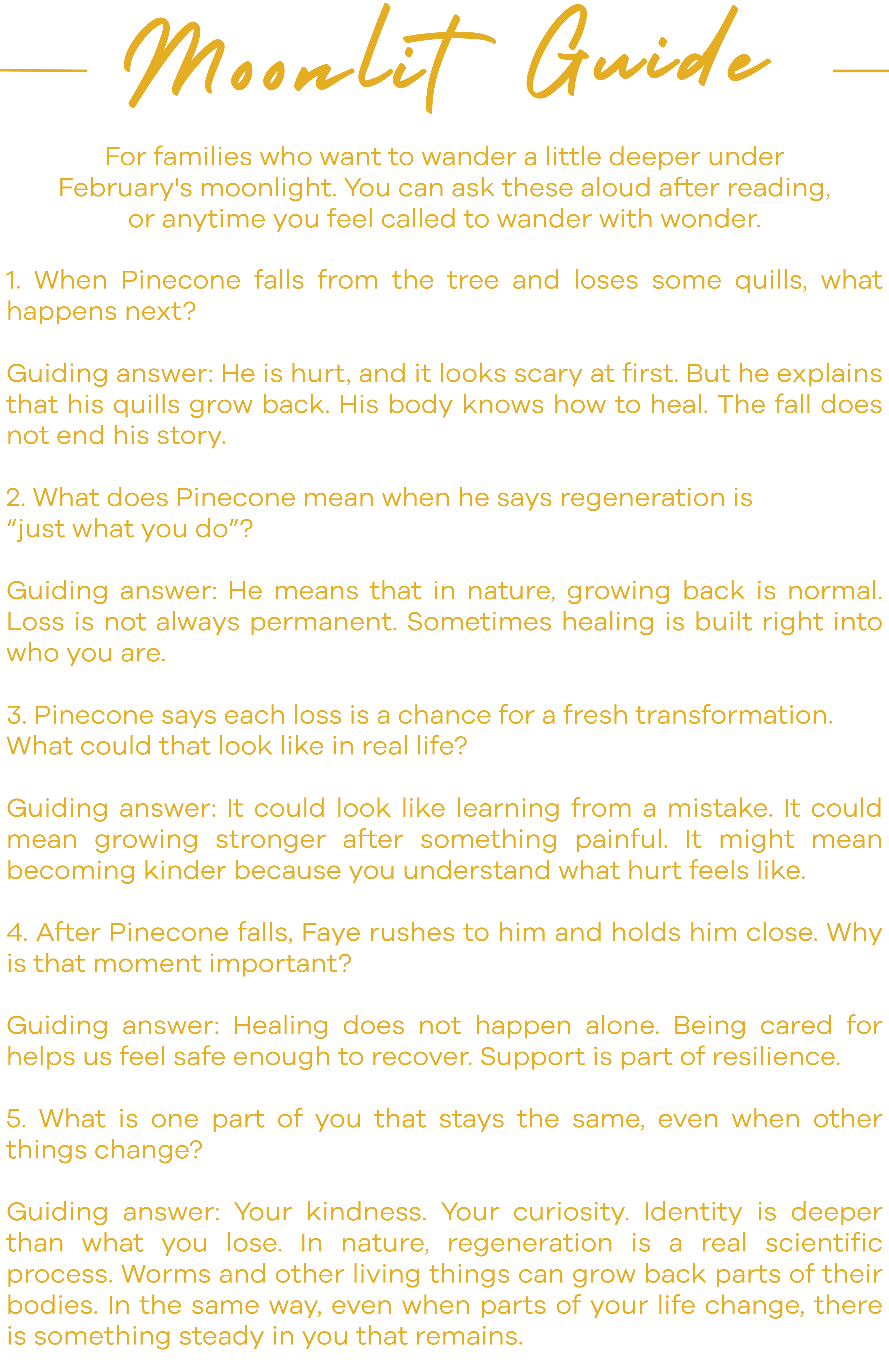 The theme of regeneration runs quietly but persistently through the narrative, echoing the Worm Moon itself. Losing quills, falling from trees, even worms splitting in half - none of this is tragic. Loss is normalized, even honoured. The message isn’t “don’t get hurt,” but “you can heal, and what grows back may be just as good or better.” That’s a beautiful lesson about resilience and self-trust. This reflects a powerful truth for readers of any age. Life will take pieces from us, but that does not mean we are diminished. Instead, loss becomes a doorway to renewal. Each break carries the possibility of transformation, not just recovery.